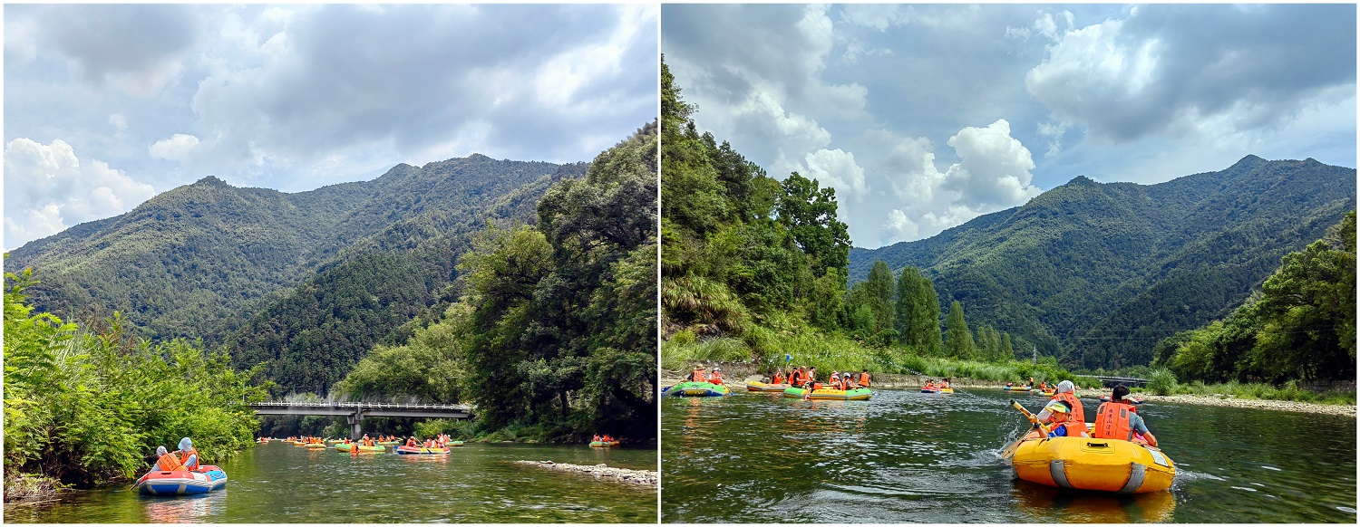 此次行程兩天一夜,在導(dǎo)游的帶領(lǐng)之下,我們首先來到石臺(tái)縣大演鄉(xiāng)剡溪村的西黃山漂流景區(qū)。下榻之時(shí),正值正午時(shí)分,景點(diǎn)兩岸青山疊嶂、風(fēng)光旖旎、草木蔥蘢、景色怡人。協(xié)普家人們換好服裝,穿上救生衣,在工作人員的協(xié)助之下,或一家?guī)卓?、或三五好友結(jié)伴乘筏而行、泛舟漂流,水面波光瀲滟、河底各式各樣的鵝卵石靜靜地躺著,日復(fù)一日被溪水沖刷,變得光滑又圓潤,坐在游筏里俯身去看,“瞧,有不少小魚正悠閑地在它的身上游過呢”,其水之清澈由此可見一斑。此次漂流全程3公里,在漂流過程中,除了欣賞到秀美的湖光山色,體驗(yàn)到劈波斬浪的沖刺暢快感,更讓人愜意的是,在河灘淺水區(qū)域漂流回緩,協(xié)普家人們正帶著孩子們,在這悠閑的時(shí)光里愉快的打起了水仗,孩子們帶上了自己心愛的水槍玩起了水槍大戰(zhàn),有人帶來了水盆和水瓢,于是乎水槍大戰(zhàn)現(xiàn)場(chǎng)演變成了潑水節(jié),歡笑聲、尖叫聲蕩漾在山谷之間,在這愜意的時(shí)光里,平日的壓力和煩擾仿佛已煙消云散。
