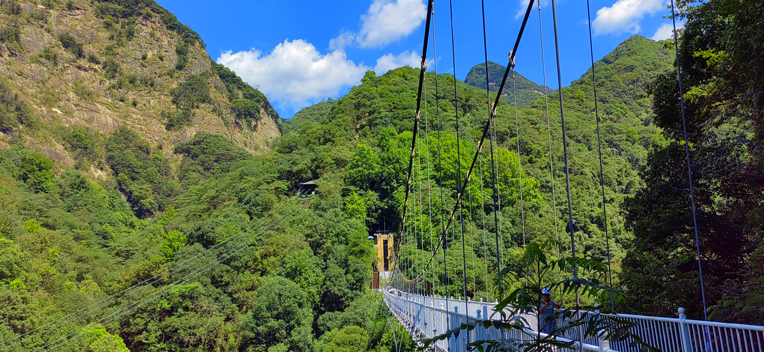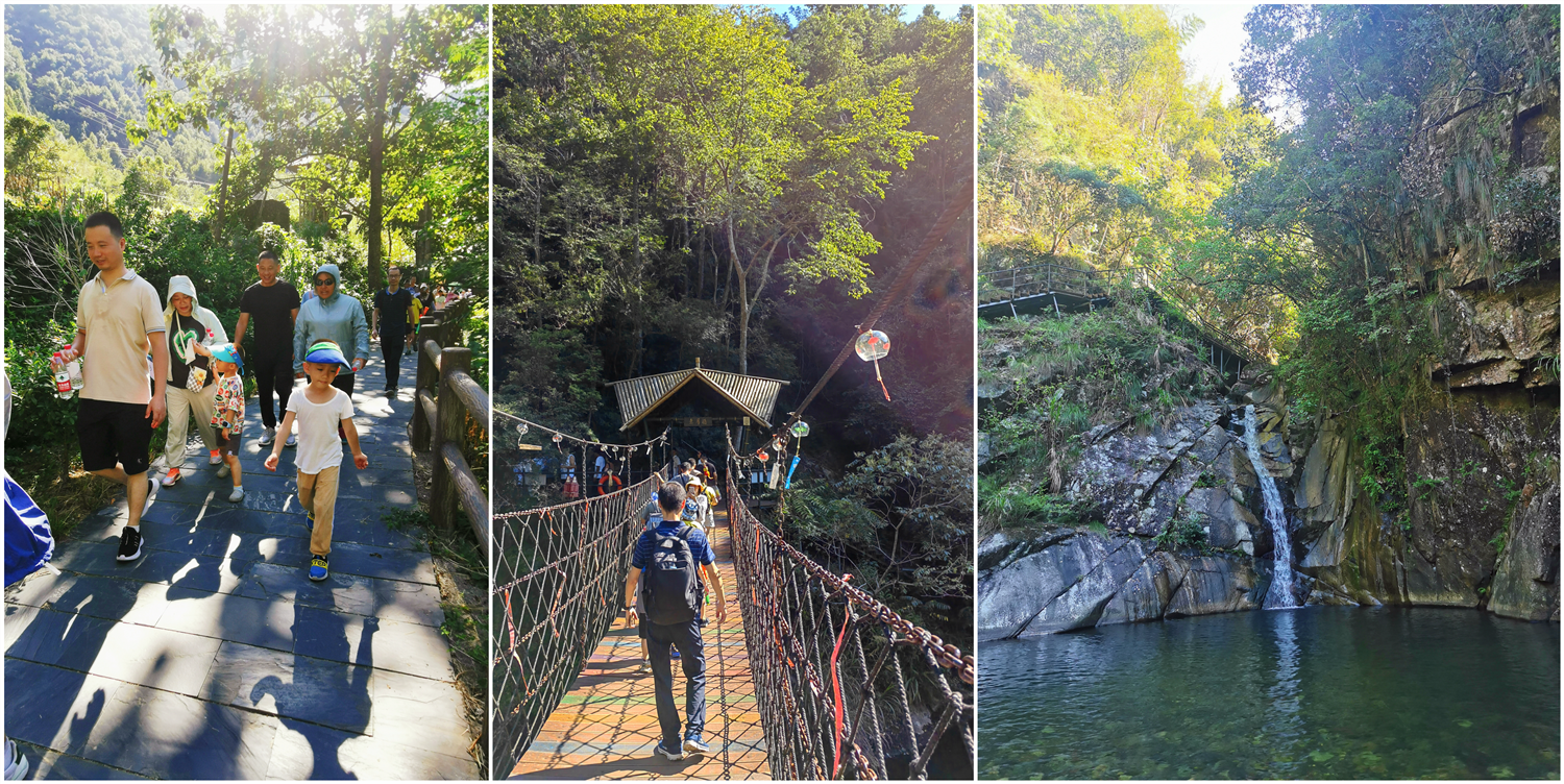 晚上體驗(yàn)了農(nóng)家樂菜肴和當(dāng)?shù)靥厣袼藓?,第二天早早的起床,吃完早餐集合,大家興致勃勃地乘著大巴來到了醉山野景區(qū),這里是安徽省內(nèi)第一個(gè)5D玻璃橋皖南地區(qū)最大的瀑布群。在進(jìn)入景區(qū)之前,有一段鄉(xiāng)村道路,徒步的過程頂著早上八九點(diǎn)的太陽就覺得酷暑難耐,然而當(dāng)我們正式踏入景點(diǎn),走在山谷間的步棧道上,遠(yuǎn)處是蔥郁的山林、近處是流動(dòng)的溪水、頂上是一片陰涼,只聽見大朋友們小朋友們都在說“好涼快啊,好涼快啊!”沿著步棧道繼續(xù)前行,來到了千花橋,這里是著名的網(wǎng)紅打卡點(diǎn),小朋友們都絡(luò)繹不絕的脫下鞋子、挽起褲腳,下水嬉戲游玩。有合影拍照的、有撿起小石片仍水花的、還有在石頭縫里抓螃蟹的。大家坐在陰涼的石頭塊上休憩閑聊,甚至玩笑起來,富硒山水、天然氧吧,以后老了退隱山林一定要來這里休養(yǎng)生息。有人不被沿途風(fēng)景耽誤過久,繼續(xù)往山上攀爬,他們到了山頂穿過了玻璃棧橋,體驗(yàn)了“一覽眾山小”的視野和格局。由于兩個(gè)月沒有下雨,雖有山谷溪流卻看不到震撼的黃崖瀑布群,實(shí)屬遺憾,卻也給大家下次再來此一游留下了機(jī)會(huì)。